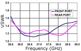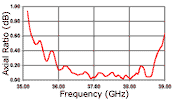 These feeds are used in offset parabolic or Cassegrain antennas for applications requiring two orthogonal circular polarizations with low axial ratio and high polarization orthogonality. They can be tailored to any 9-10% frequency band up to 40 GHz. The performance of a 37 GHz model is shown below.